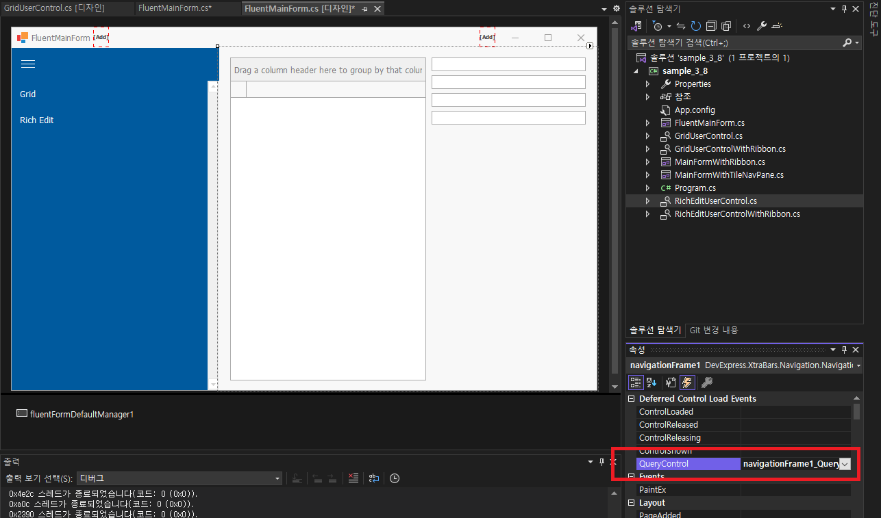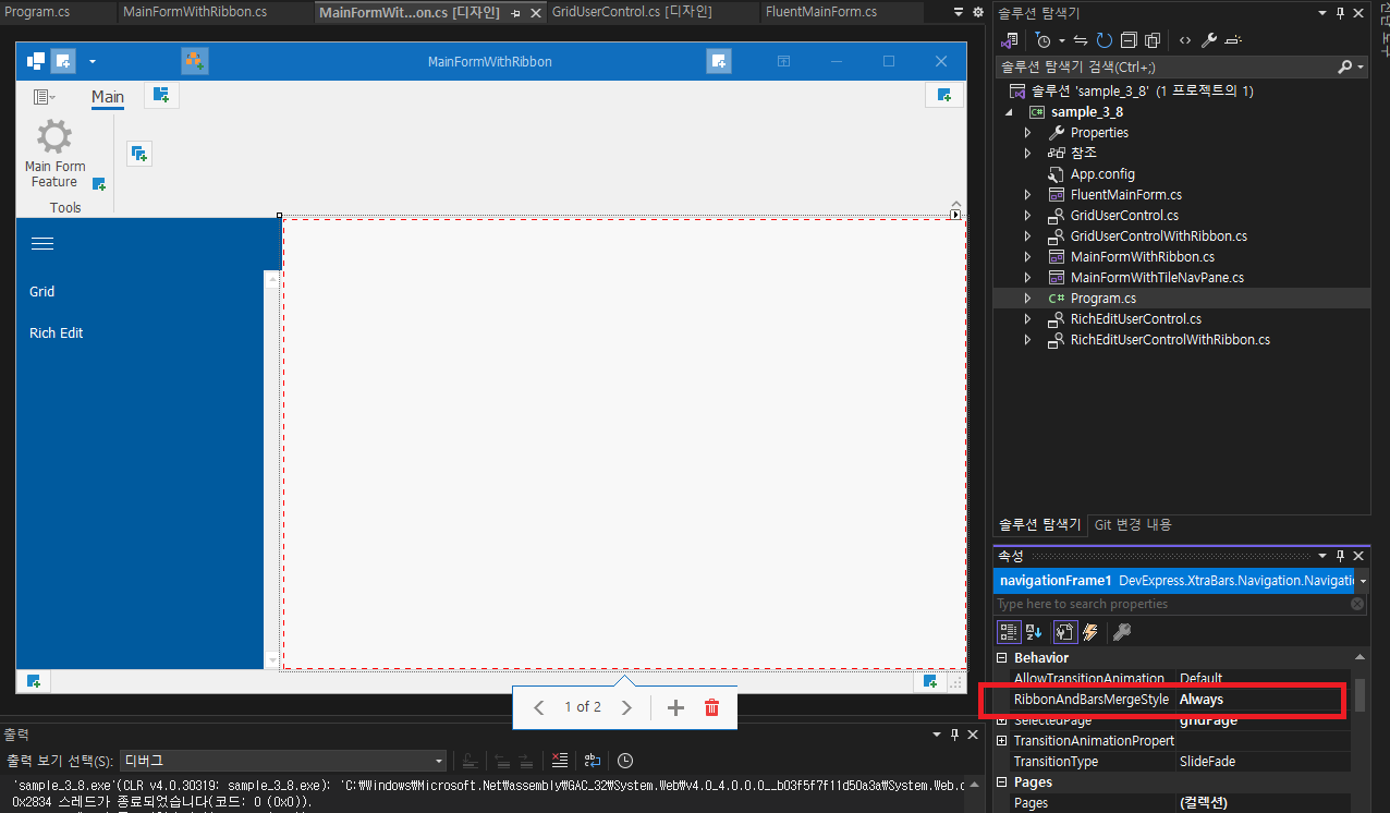 - 실행하면 navigationFrame1이 자동으로 이전과 같이 그리드 페이지를 표시하고, 리본이 변경되는 리치 편집페이지로 전환하면 리본의 도구그룹에서 그리드 특정 버튼을 볼 수 있습니다.