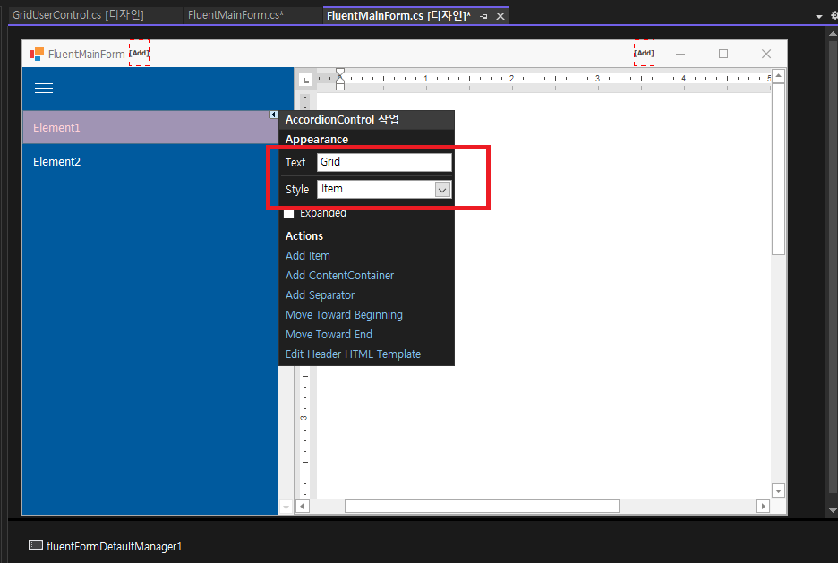 - 이제 아코디언 컨트롤(accordion control)에 항목을 추가합니다(Element2).