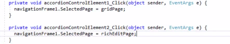 - 두 항목 모두에 이벤트 핸들러를 추가하고, 기능을 구현하기 위해 Navigation Frame의 활성 페이지를 변경합니다.