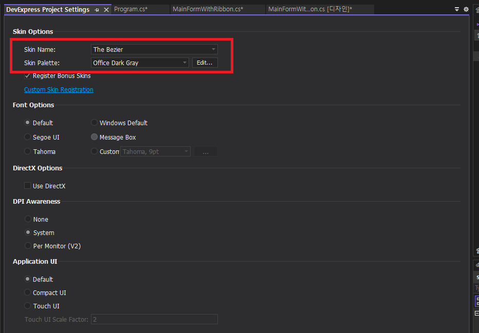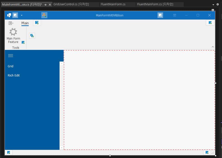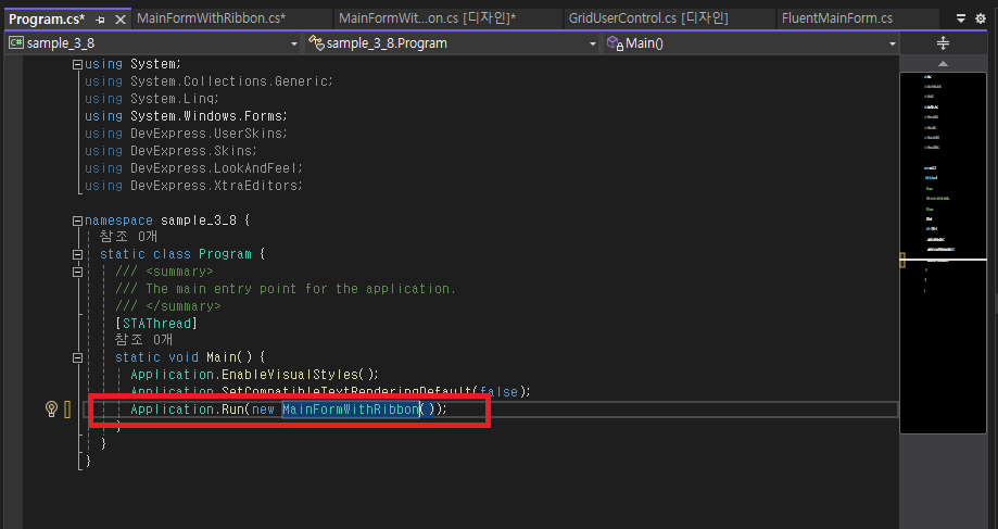 - 프로그램 실행(Progrma.cs)을 기본에서 MainFormWithRibbon으로 변경합니다.