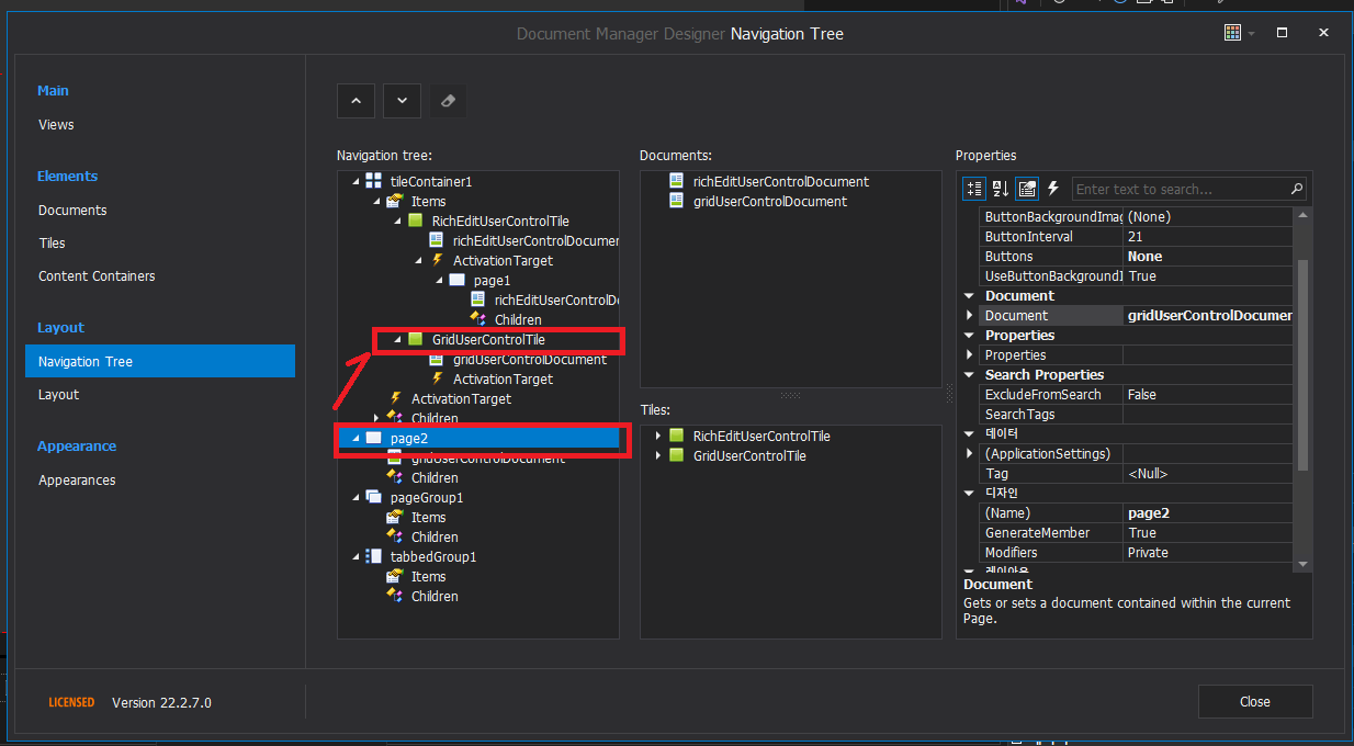 - Documents에 있는 컨트롤 2개도 pageGroup1과 tabbedGroup1에 드래그하여 추가 합니다.