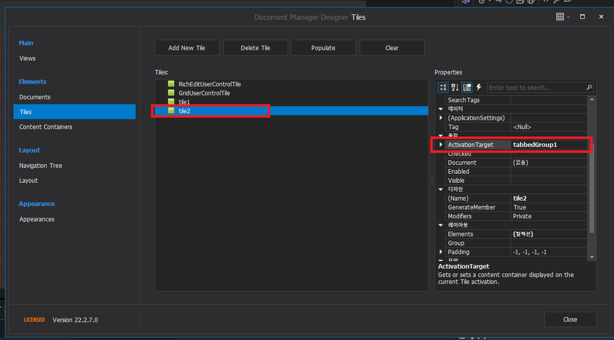 - 기본적으로 탐색트리(Navigation Tree)가 자동으로 타일컨테이너의 타일을 문서와 연결합니다. 지금까지 타일이 생성되었습니다.