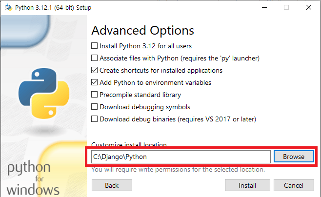 - 사용자 설정 : Customize installation (사용자 특정폴더 설정시 사용)