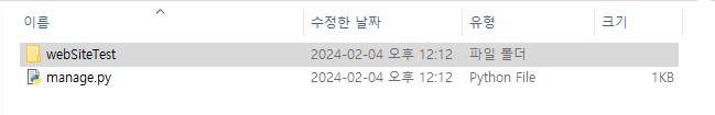- webSiteTest 디렉토리가 하나 생성되고, 디렉토리에 manage.py 파일과 함께 프로젝트이름과 동일한 디렉토리가 하나 더 생성되어 있는것을 확인할 수 있습니다.