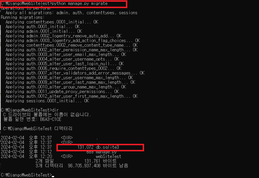 - 프로젝트 디렉토리에서 python manage.py migrate 라고 입력합니다.