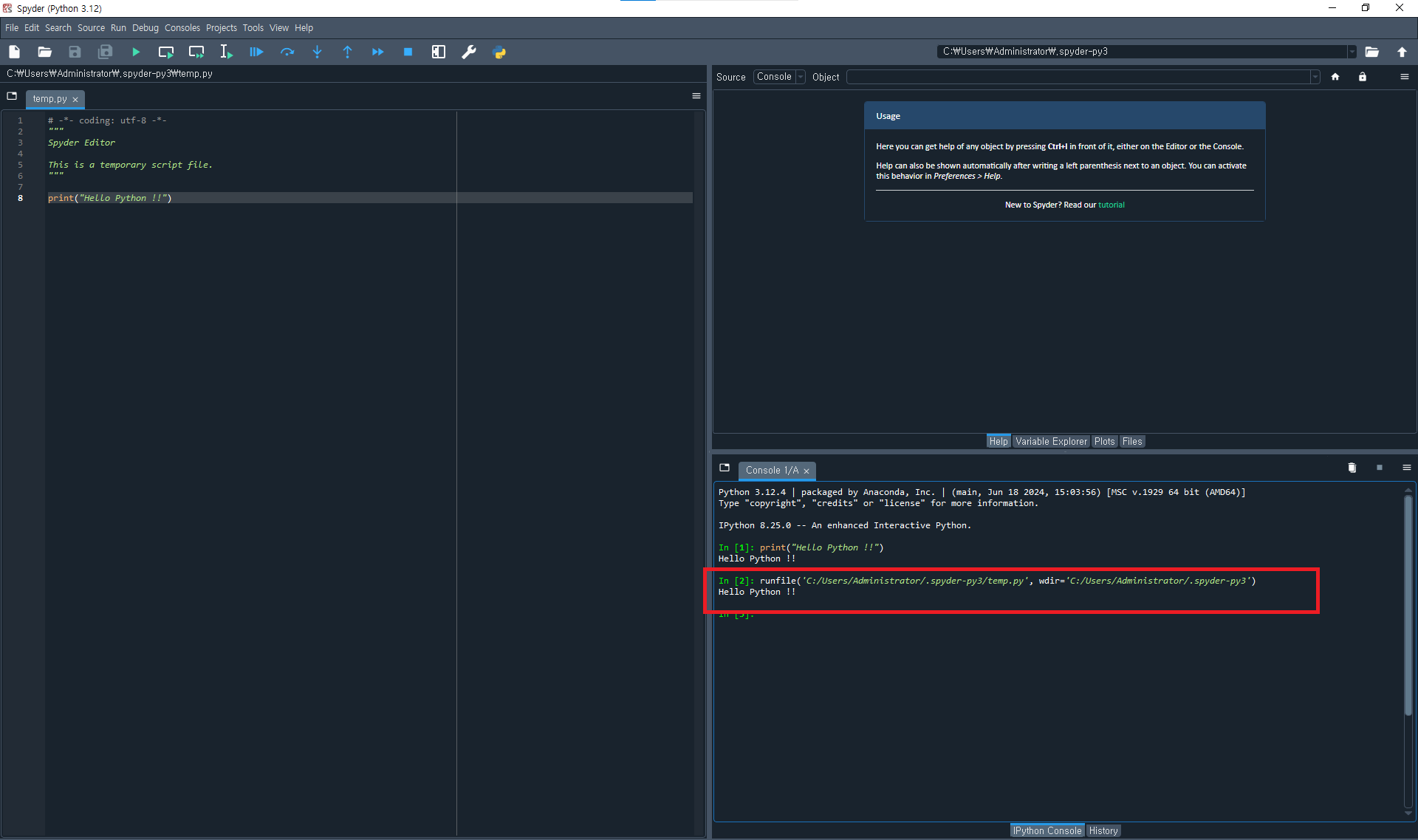 - "Hello Python" 실행를 위해 기본 신규생성, 저장, 실행 버튼이 있어 바로 결과를 확인할 수 있습니다.